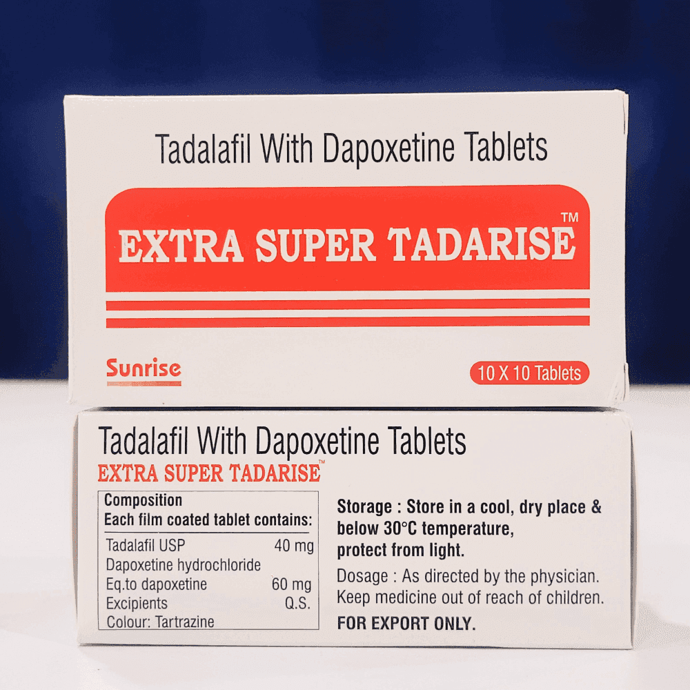 Tadalafil with Dapoxetine Extra Super Tadarise combines two clinically proven active ingredients (40mg + 60mg) to address dual sexual health concerns— Male sexual dysfunction and early discharge treatment—simultaneously.