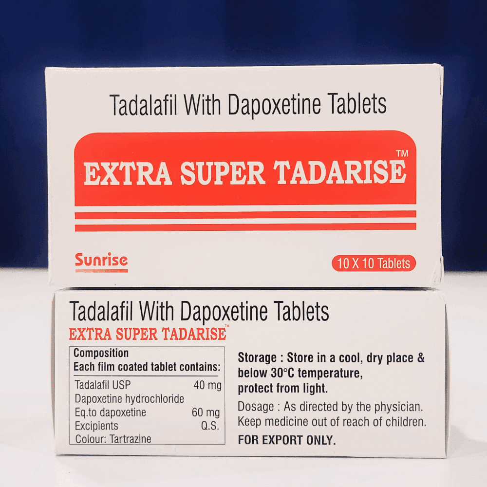 Extra Super Tadarise contains Tadalafil 40mg, while Super Tadarise contains Tadalafil 20mg. Both have Dapoxetine 60mg. Extra Super Tadarise is stronger and suits more severe ED cases.