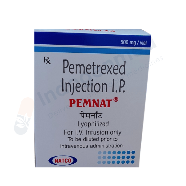 Pemnat 500 MG Injection are manufactured by Natco Pharma in India and contain 500 mg of Pemetrexed per injection. Each Vial includes Single vial, making Pemnat 500 MG Injection an effective option for Chemotherapy . Prescription Required from your healthcare provider to purchase Pemetrexed medicine. Indogenmed deals in all type of generic Pemetrexed medicine.