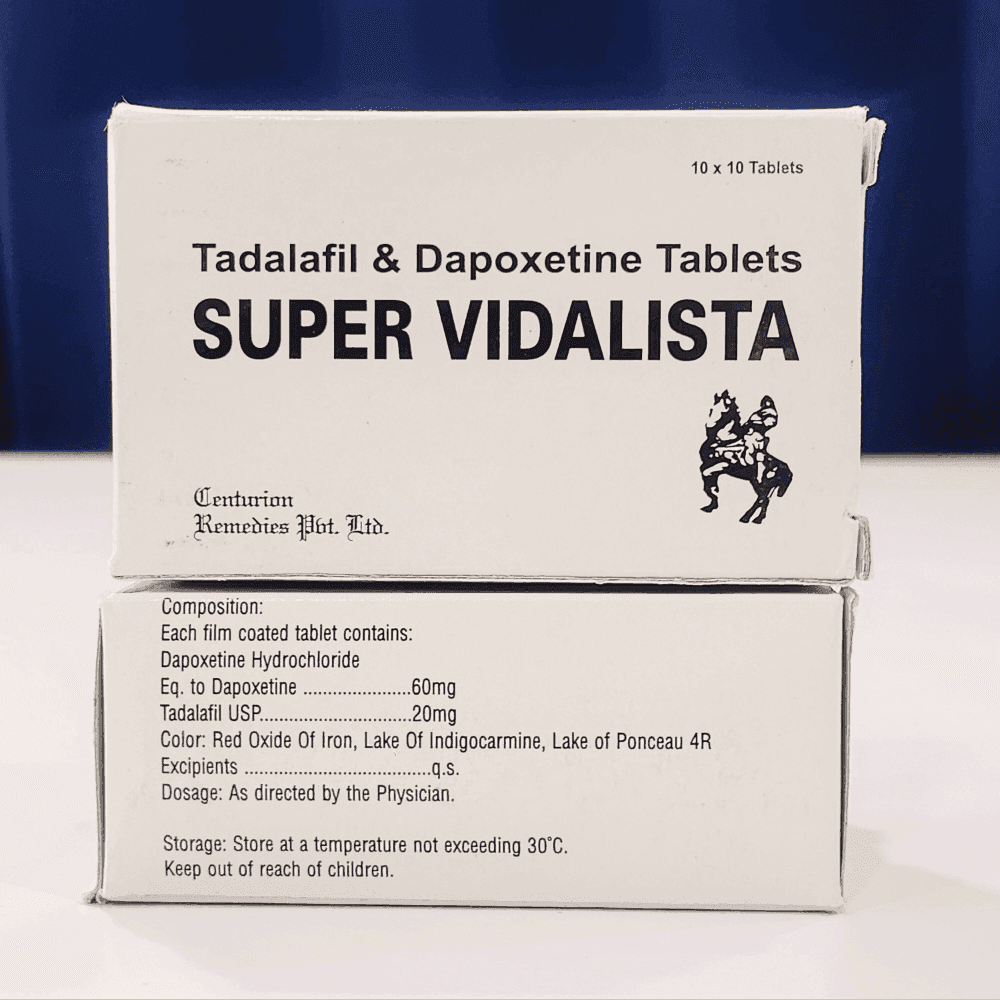 Super Vidalista is a dual-action men’s health tablet containing Tadalafil 20 mg and Dapoxetine 60 mg. It is used to treat both erectile dysfunction (ED) and premature ejaculation (PE) simultaneously in a single tablet. The Tadalafil component helps achieve a firm erection while Dapoxetine delays ejaculation for improved sexual performance.