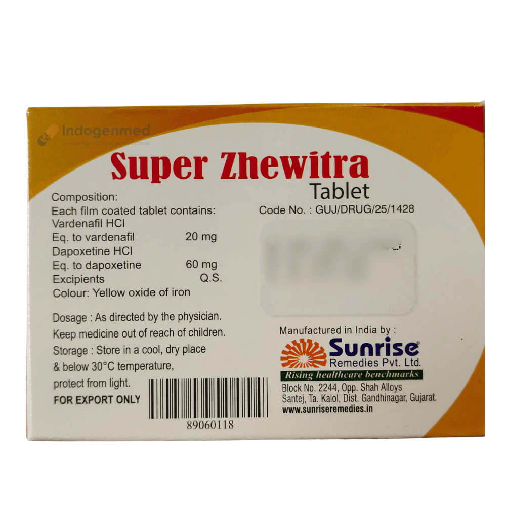 Super Zhewitra is a combination medication designed to treat erectile dysfunction and premature ejaculation simultaneously. Each tablet contains vardenafil, which improves blood flow to the penis during sexual stimulation and helps achieve and maintain an erection.