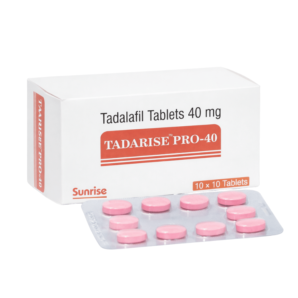 Tadarise Pro 40 mg is a prescription medicine for erectile dysfunction (ED) in adult men. It contains tadalafil 40 mg, a phosphodiesterase type-5 (PDE5) inhibitor. Tadalafil is the same active ingredient found in the brand Cialis. Tadarise Pro is a generic tadalafil product from Sunrise Remedies, available in selected markets.