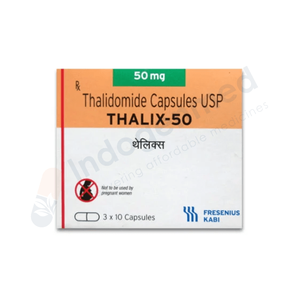 Thalix 50mg Capsules are manufactured by Fresenius Kabi India Pvt Ltd in India and contain 50mg of Thalidomide per capsule. Each Blister pack includes 1×10 Capsule, making Thalix 50mg Capsules an effective option for Blood Cancer. Prescription Required from your healthcare provider to purchase Thalidomide medicine. Indogenmed deals in all type of generic Thalidomide medicine.