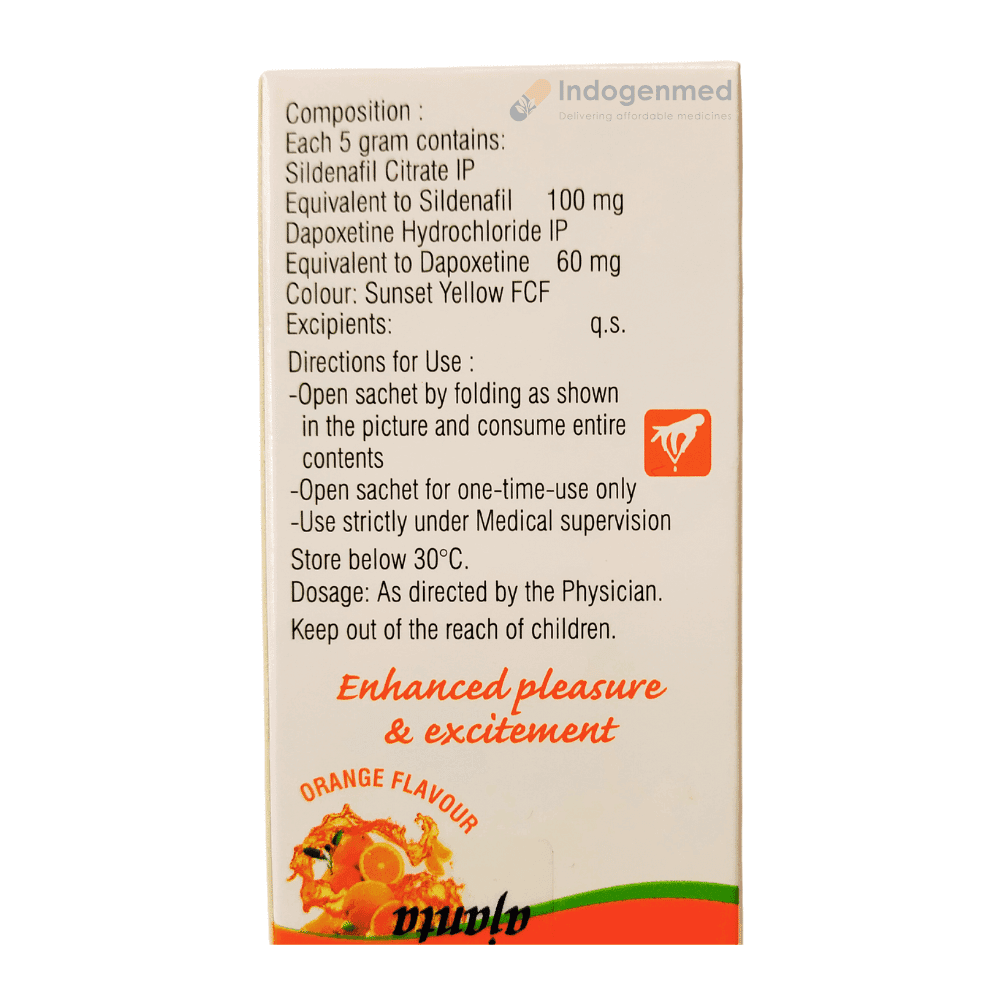 • 药物警告:如果您有心脏病史或血压波动严重,请避免服用,因为性活动可能会加重心脏负担。• 药物相互作用:请勿与含硝酸盐的治疗心绞痛的药物、抗抑郁药、精神药物或α受体阻滞剂同时服用。• 分享:请勿与他人分享此处方药,即使是与患有相同疾病的人也不行。• 饮酒和吸毒:避免饮酒和吸食毒品,因为它们可能会加剧副作用并降低疗效。• 操作重型机械:由于可能出现头晕或嗜睡,请避免驾驶或操作重型机械。• 肝病:如果您患有肝病,请勿服用;请务必告知您的医生您的病史。合格的医生应根据个人健康状况开具超级卡玛格拉口服凝胶、西地那非和达泊西汀。